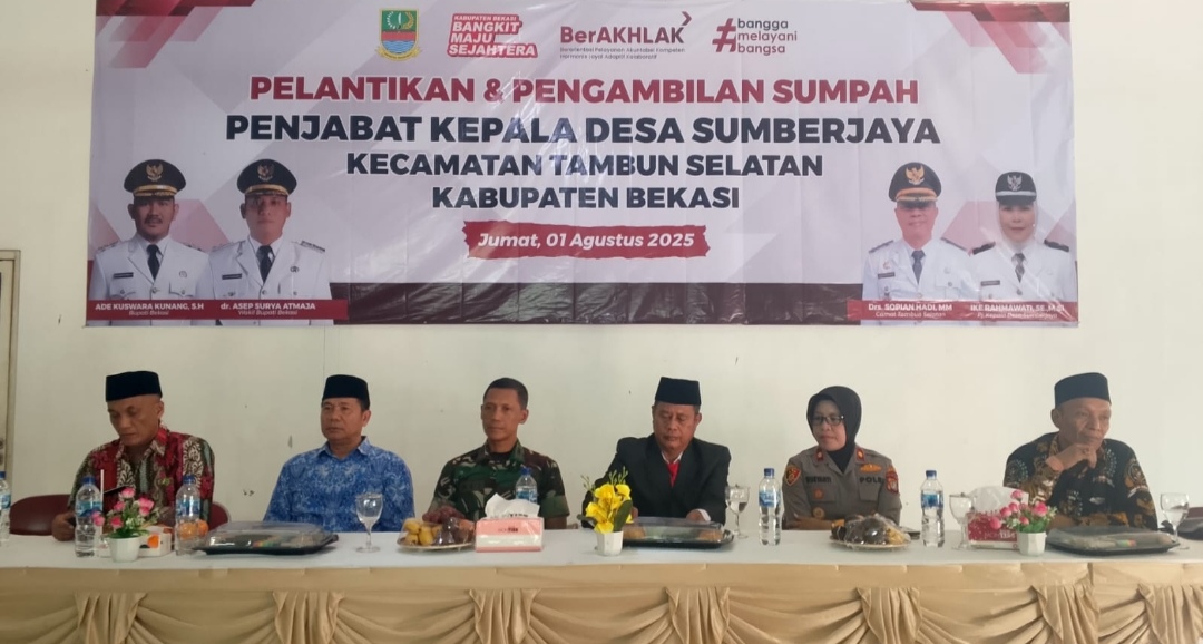 BEKASI ~ Ike Rahmawati, SE., M.Si secara resmi dilantik sebagai Pelaksana Tugas (Plt) Kepala Desa Sumberjaya pada Jumat, 1 Agustus 2025, di Aula Serbaguna Desa Sumberjaya. Prosesi pelantikan yang dipimpin langsung oleh Camat Tambun Selatan, Drs. Sopian Hadi, MM, tersebut dihadiri oleh berbagai unsur masyarakat, termasuk Unsur Muspika, Babinsa, Bhabinkamtibmas, Ketua BPD, perangkat desa, kader PKK, dan tokoh masyarakat setempat.