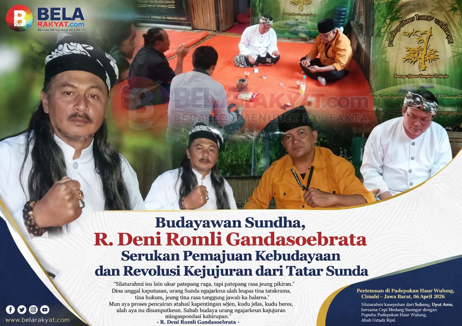 Budayawan Sundha, R. Deni Romli Gandasoebrata, dalam pernyataannya menegaskan bahwa pertemuan ini bukan sekadar ritual sosial, melainkan bagian dari upaya menjaga marwah budaya dalam arus modernitas. “Silaturahmi ieu lain ukur patepang raga, tapi patepang rasa jeung pikiran. Dina unggal kaputusan, urang Sunda ngajarkeun ulah leupas tina tatakrama, tina hukum, jeung tina rasa tanggung jawab ka balarea. Mun aya proses pencairan atanapi kapentingan séjén, kudu jelas, kudu beres, ulah aya nu disumputkeun. Sabab budaya urang ngajarkeun kajujuran minangka pondasi kahirupan,” ujarnya dengan nada tenang namun penuh penekanan.
