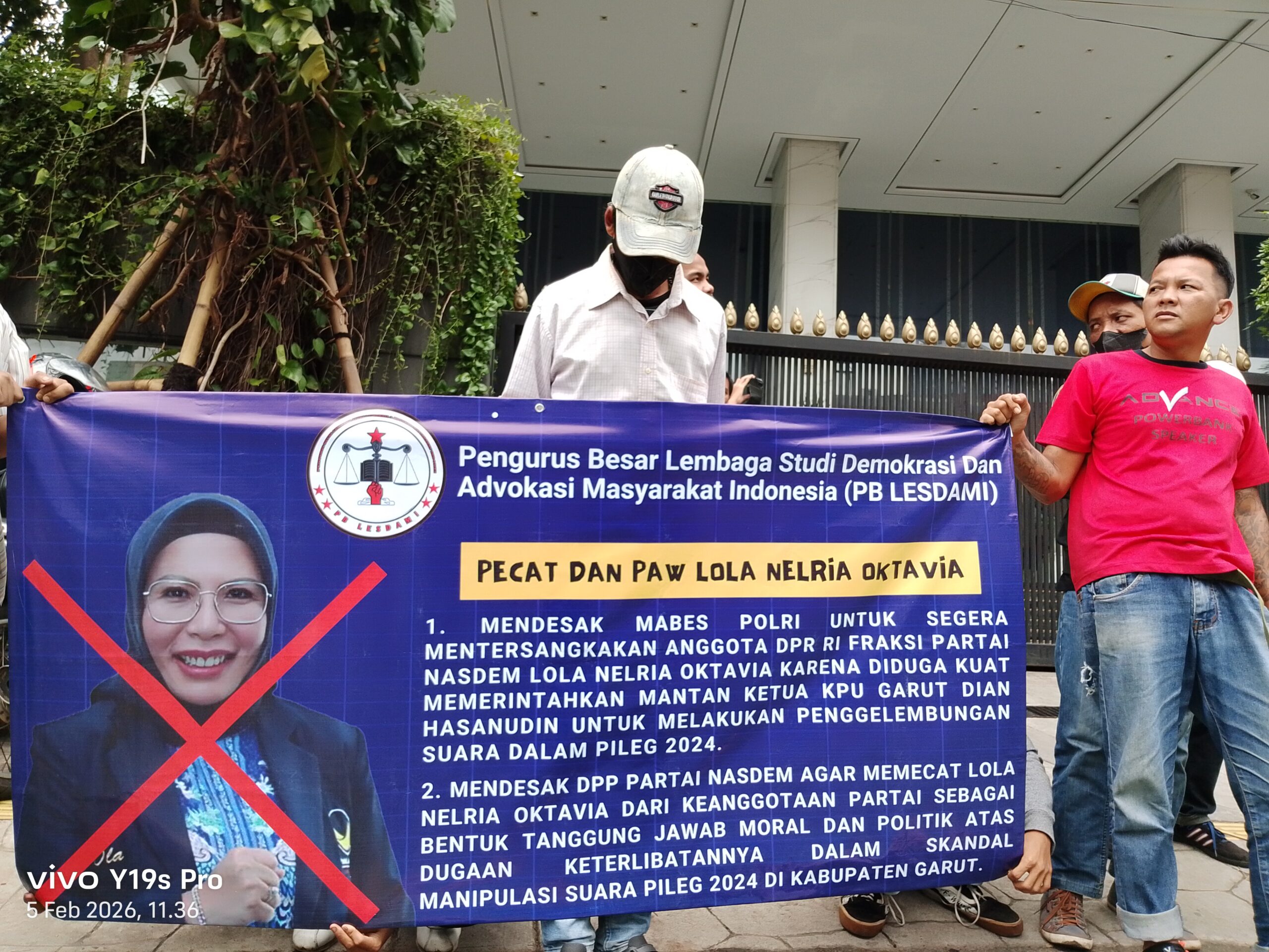 “Kami mendesak partai NasDem untuk pecat dan PAW Bu Lola. Kami menilai Bu Lola ini diduga kuat aktor intelektual penggelembungan suara sehingga dia duduk di Senayan,” ujar Badi Farman di depan DPP NasDem, Jakarta, Kamis (5/2/26).