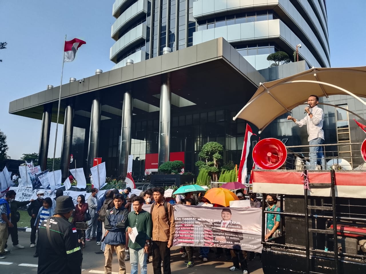“Kami desak KPK panggil, periksa dan tersangkakan Menpora Dito dalam kasus BTS. Sebab saksi di persidangan sudah jelas menyebutkan bahwa Dito terima uang,” kata Suarsanto dalam orasinya di depan KPK, Jakarta, Senin (1/9/25).