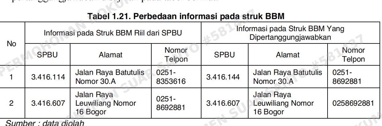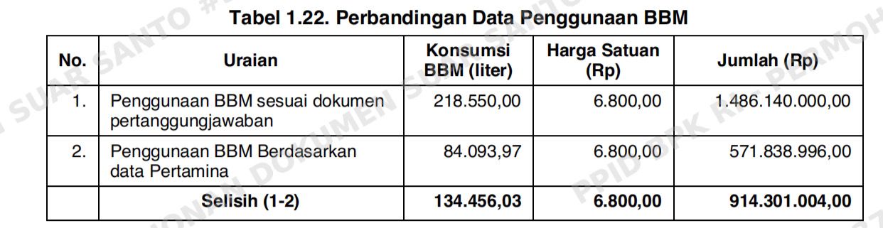 Selain itu, BPK juga menemukan 47 unit kendaraan menggunakan dokumen pertanggungjawaban BBM yang tidak sesuai fakta. Konfirmasi dengan pengawas SPBU serta data PT Pertamina Regional Jawa Bagian Barat menunjukkan adanya selisih besar dalam penggunaan BBM.