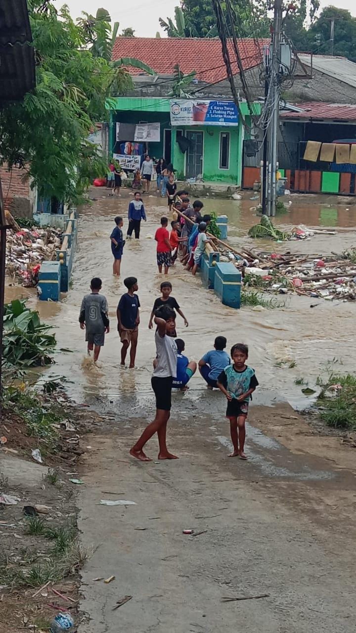Emak Dewi, warga sekitar Jl. Cagak Sumantri, Cikarang Utara, meluapkan kekesalannya karena sudah 2 hari ini rumahnya terdampak banjir, dengan logat khas Bekasi. “Gua kirain abis gasar-gusur Bekasi udah bebas banjir, buset malah kelelep! Ga angin, ga ujan, kok bisa begini? Jadi pemimpin itu jangan bikin susah rakyat, nanti kualat. Pemimpin tuh kudu bikin rakyat sejahtera, bukan malah sengsara,” ujarnya tegas, mencerminkan kekecewaan masyarakat kecil yang terdampak langsung.