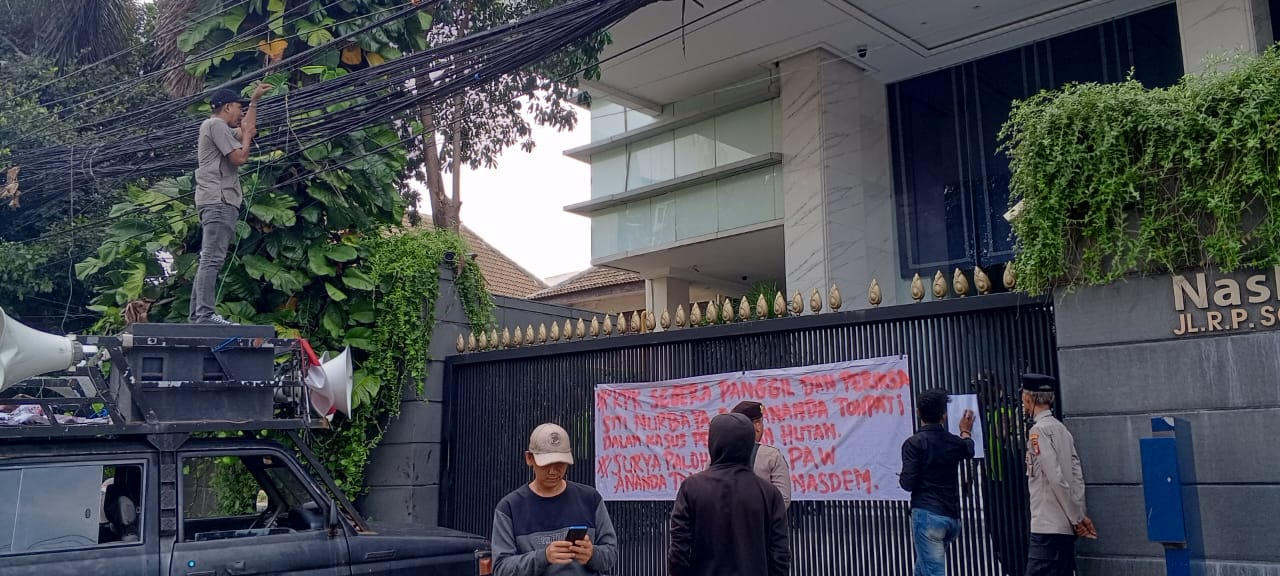 JAKARTA – Koalisi Masyarakat Anti Korupsi Indonesia menggelar aksi demonstrasi di depan Tower NasDem, Jakarta, Jumat (3/10/2025). Aksi ini dipimpin oleh Wijji selaku koordinator lapangan. Mereka menuntut Komisi Pemberantasan Korupsi (KPK) mengusut tuntas dugaan praktik korupsi terkait izin pengelolaan kawasan hutan PT Inhutani V.