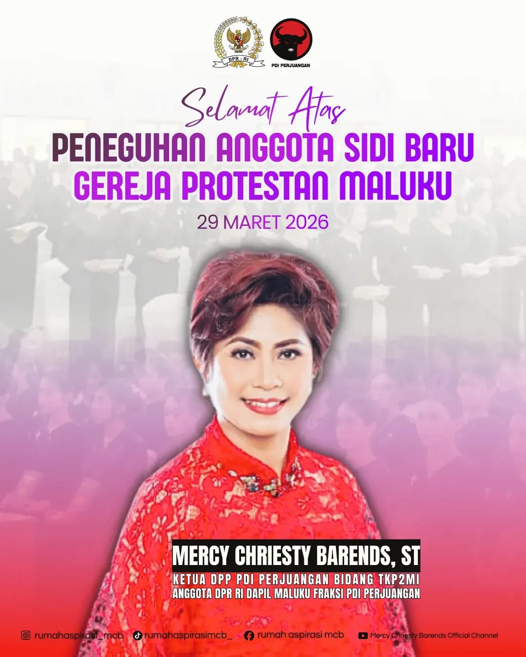 JAKARTA – Anggota DPR RI Dapil Maluku dari Fraksi PDI Perjuangan, Mercy Chriesty Barends, menilai peneguhan 14.810 anggota sidi Gereja Protestan Maluku pada Minggu (29/3/2026) sebagai peristiwa keagamaan yang memiliki dampak sosial luas bagi masyarakat Maluku.