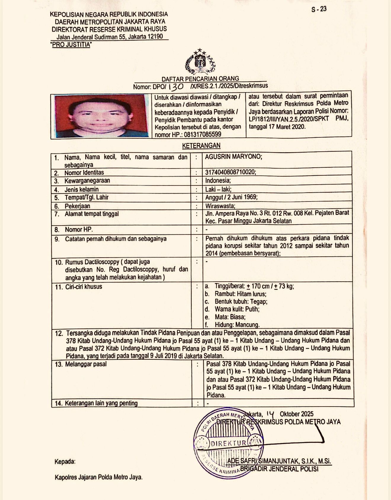 Kabidhumas Polda Metro Jaya, Kombes Pol. Budi Hermanto yang ditanyakan terkait status DPO Agusrin dan Raden Saleh, membenarkan penetapan status tersebut. “Benar, sudah diterbitkan DPO karena berkas perkara sudah P21, tinggal tahap II pelimpahan tersangka dan barang bukti,” ujar Budi Hermanto yang akrab disapa Budher.