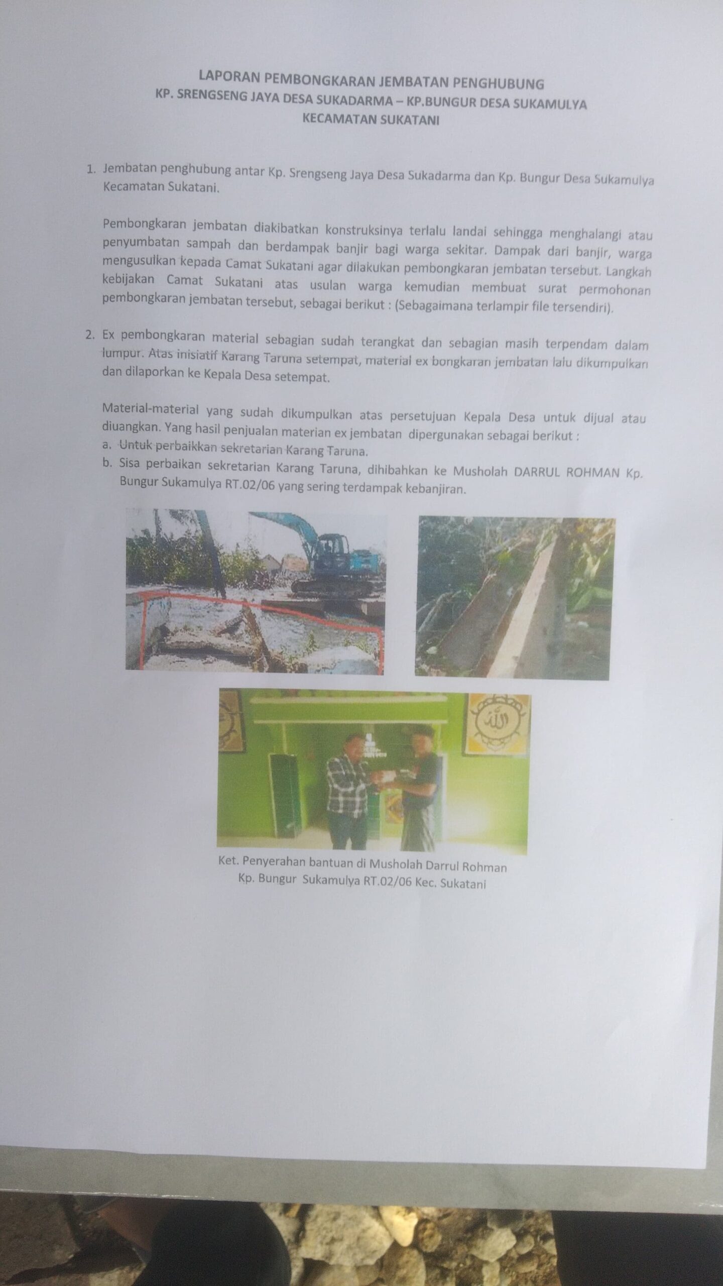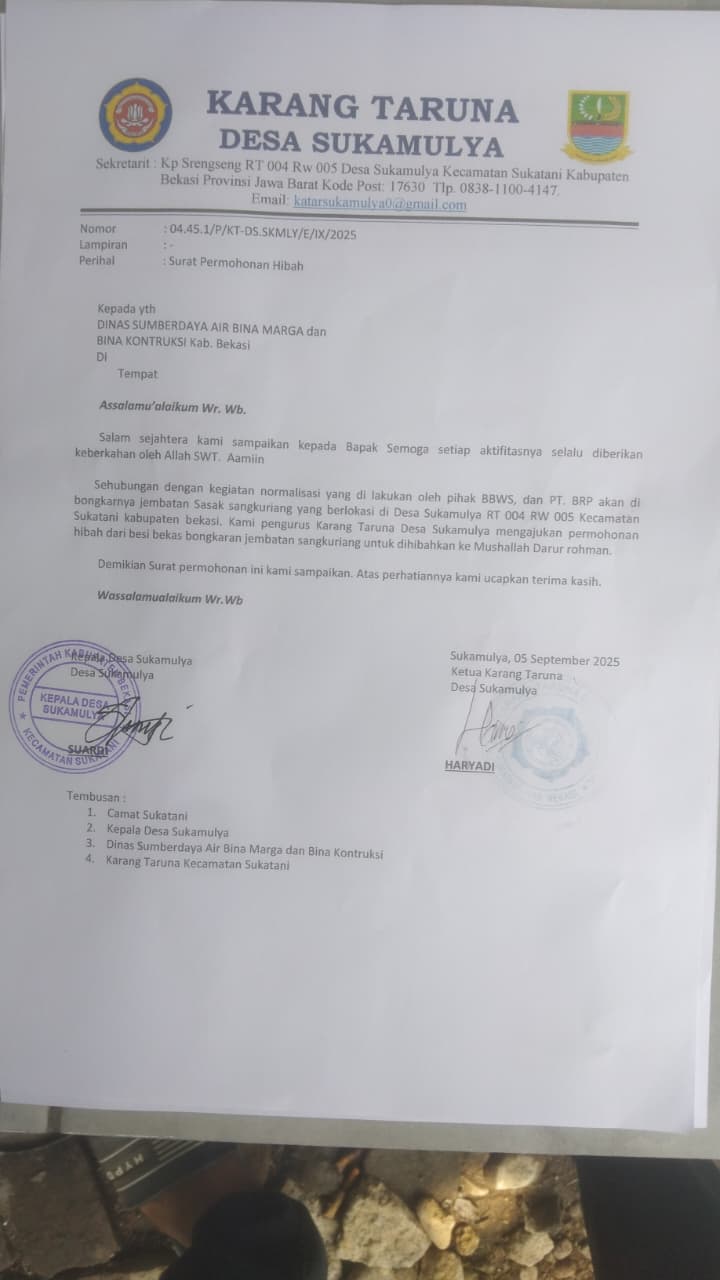 Yang membuat publik makin terperangah, munculnya surat permohonan hibah oleh Karang Taruna Desa Sukamulya ke Dinas Sumber Daya Air, Bina Marga dan Bina Konstruksi Kabupaten Bekasi, bernomor: 04.45.1/P/KT-DS.SKMLY/E/IX/2025, meminta hibah besi bekas jembatan yang sudah dibongkar, untuk kemudian diberikan ke mushalla. Surat ini muncul setelah jembatan dibongkar dan di hari yang sama saat warga menggelar aksi protes.